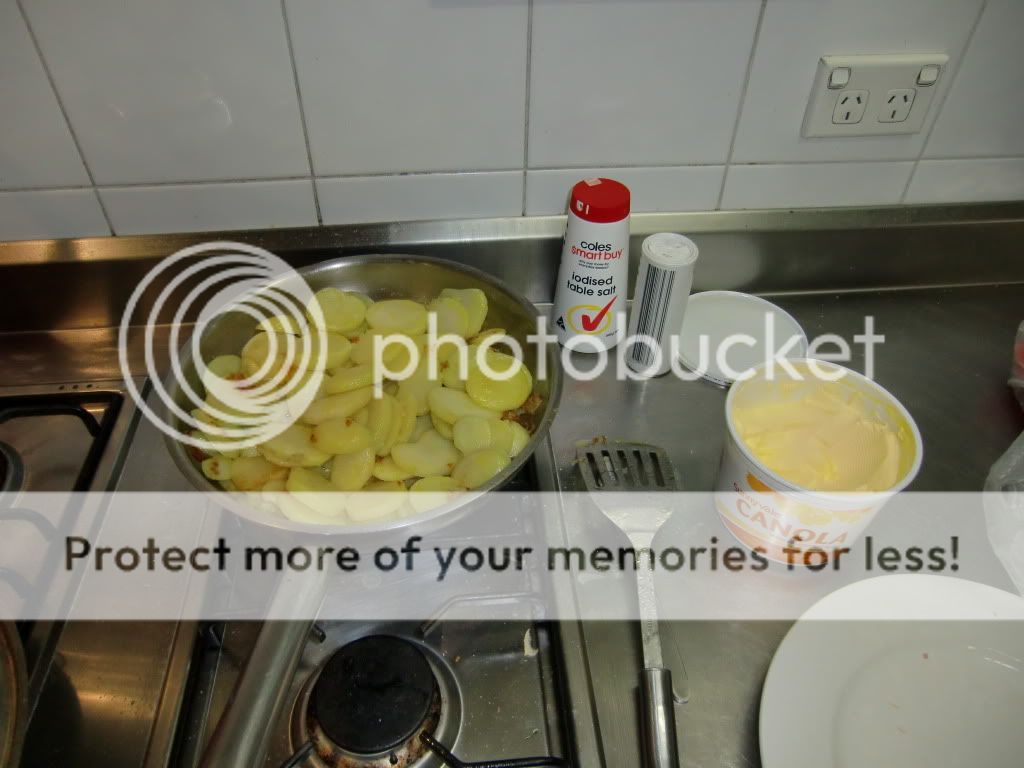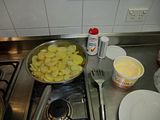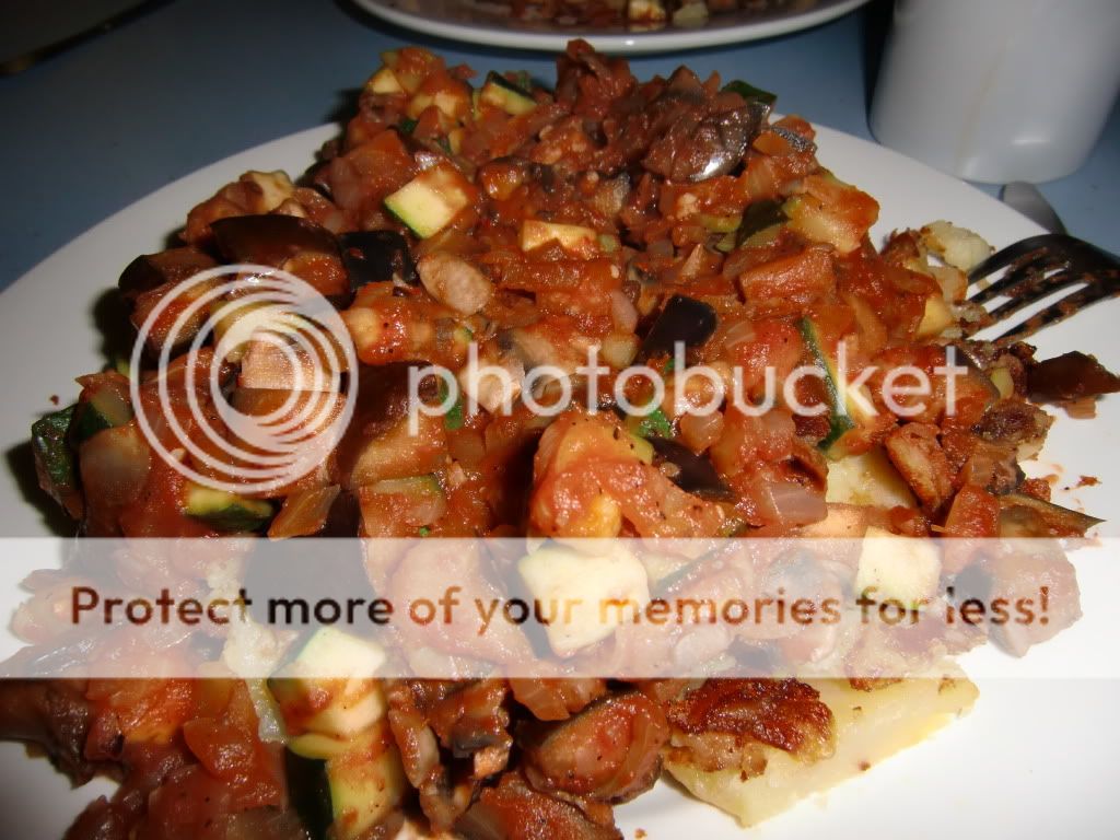 Heute Abend gab es: Bratkartoffeln mit einer Aubergine – Zucchini – Pilze – Zwiebel – Knoblauch – Tomatensosse.