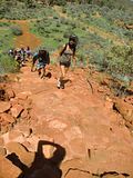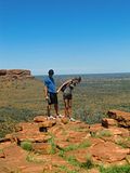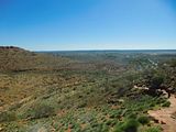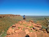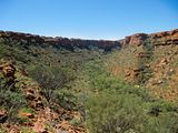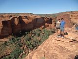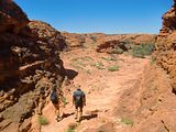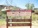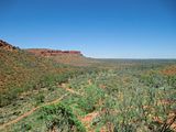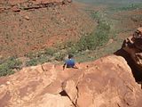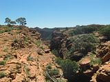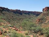Wir kamen gegen halb 11 am Kings Canyon an und waren mehr als glücklich über unsere neuste Investition, die wir vorsorglich noch in Alice Springs gekauft hatten. Fliegennetze, die man über die Kappe zieht und mit einem Gummiband am Hals zuzieht. Bei den Massen an Fliegen, die einem hier sonst rücksichtslos ins Gesicht fliegen eine wahre Wohltat. Während der Tour liefen 15 von 21 Personen mit einem solchen Netz vorm Gesicht rum, man sah also nur halb so bescheuert aus, wie man sich fühlte.