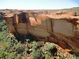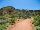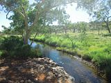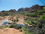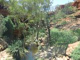 Auf dem Weg hat sich unser Eindruck, den wir schon während des Fluges nach Alice Springs bekommen haben, bestätigt. Die ausgetrocknete Wüste, die wir uns vorgestellt haben, ist echt grün zur Zeit, die Bäume haben frische Blätter, es gibt überall frisches Gras und man sieht hin und wieder tatsächlich noch kleine Flüsse, Seen und Pfützen. Hatten wir so nicht erwartet.