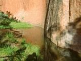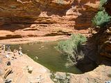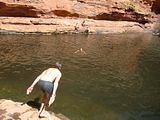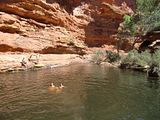 Nach dieser ersten Einführung in die Welt der Aborigines marschierten wir weiter, durch eine Schlucht hindurch die uns zum „Garden of Eden“ führte. Da es hier in Alice Springs ein paar Tage vor unserer Ankunft noch geregnet hat waren die Wasserlöcher gefüllt und wir konnten tatsächlich eine Runde in diesem natürlichen Pool schwimmen. Sehr erfrischend nach 2 Stunden wandern durch die Hitze.