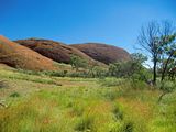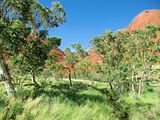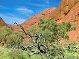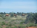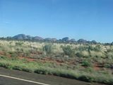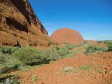 Gegen halb 7 brachen wir von dort aus auf in Richtung Kata Tjuta, was nur schlappe anderthalb Stunden entfernt lag. Auf dem Weg dorthin haben wir zum ersten Mal wilde Kamele am Straßenrand gesehen, die in aller Seelenruhe die Blätter von den Bäumen fraßen.